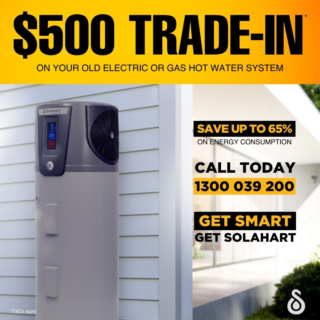 *$500 Trade-in is applied as a point-of-sale discount to the purchase of an eligible 270L and above Solahart Solar/Renewable Hot Water System when replacing an existing water heater. Offer only available from Solahart Sunshine Coast, Gympie & Caboolture. Offer expires 28/02/2026.