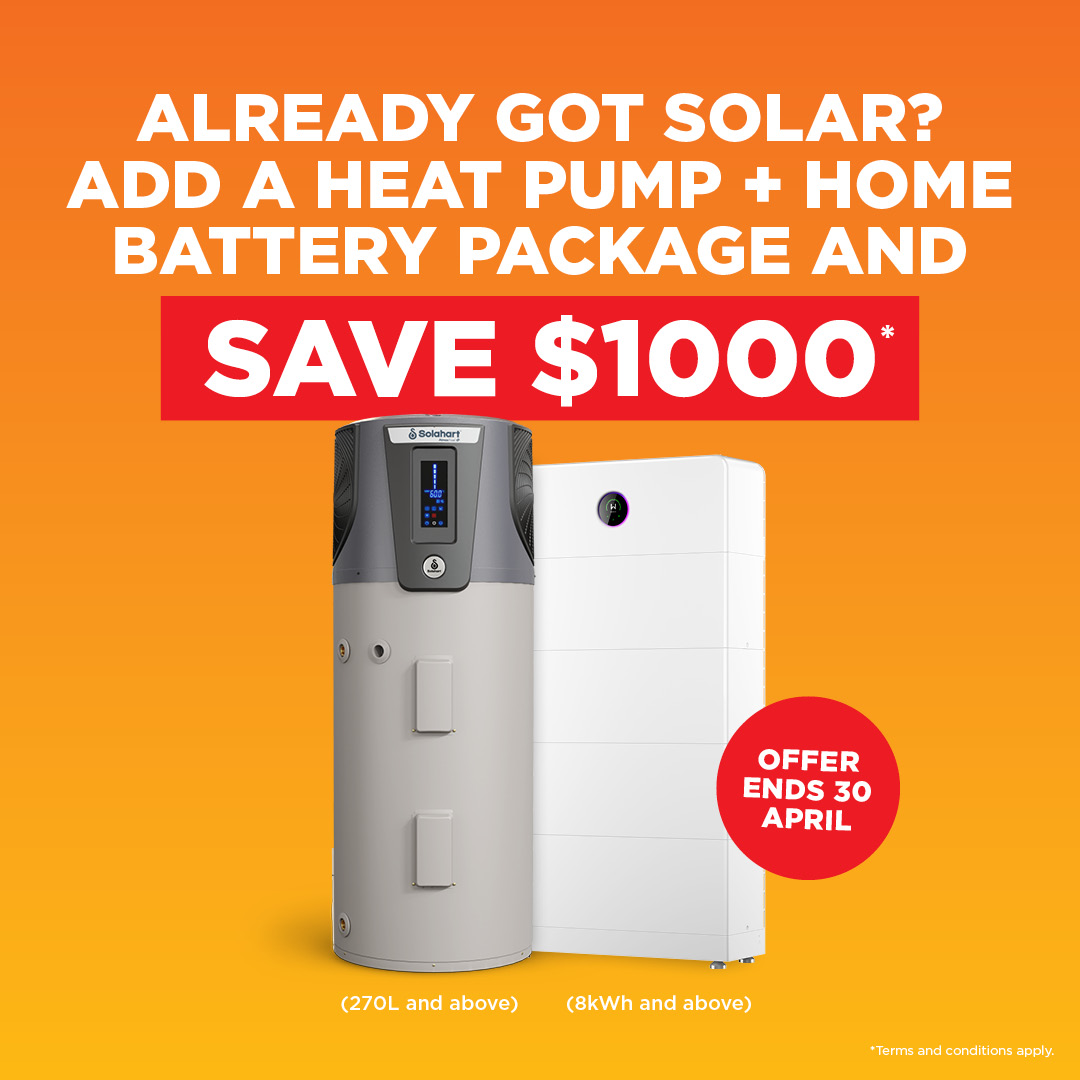 *$1,000 point of sale discount applies to the purchase of a package deal that includes an eligible Solahart Heat Pump (270L litres and above) together with a Home Battery (8kWh and above) in one transaction. Offer available from 10/03/2026 until 30/04/2026. Excludes commercial installations and Tesla Batteries. Not available in conjunction with any other offer.